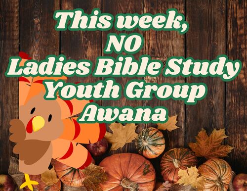 This week we will NOT be having Ladies Bible Study, Youth Group, or Awanas!!